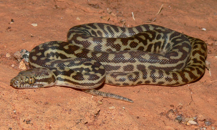 The spotted python shows greyish-brown to sandy-blonde colouring with larger chocolate to reddish-brown spots. The Children’s Python has the most distinctive appearance, with dark tan markings forming distinct bands rather than blotches.